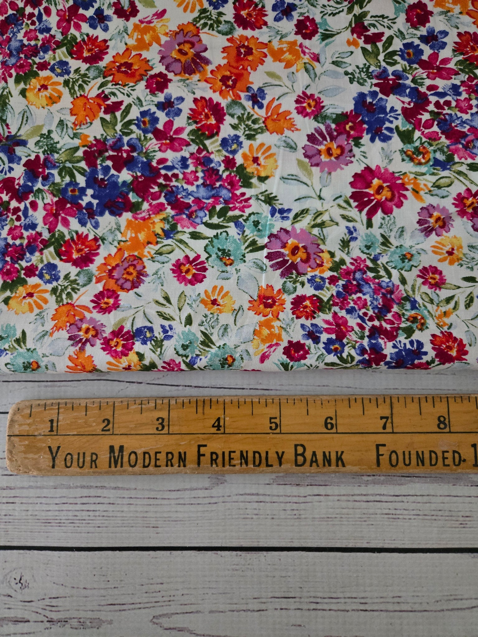 Bright meadow floral. This is a very soft, lightweight cotton! Has slight bias stretch.