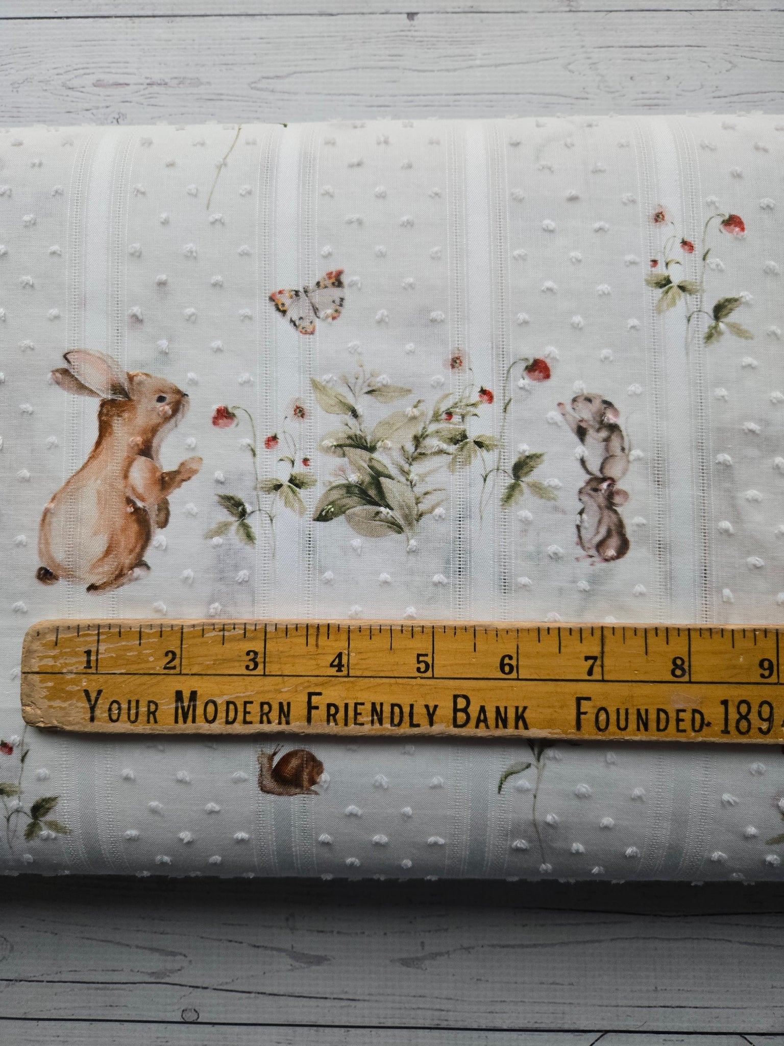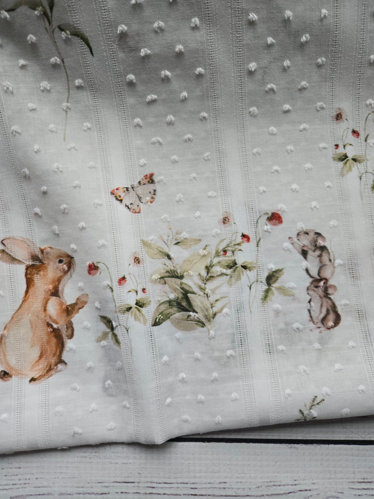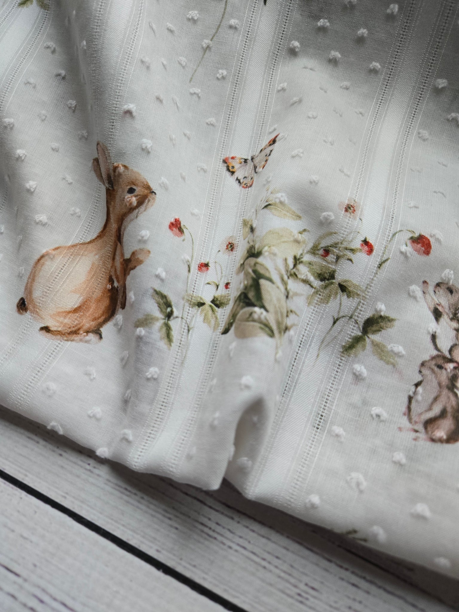 White with darling bunnies and strawberries.