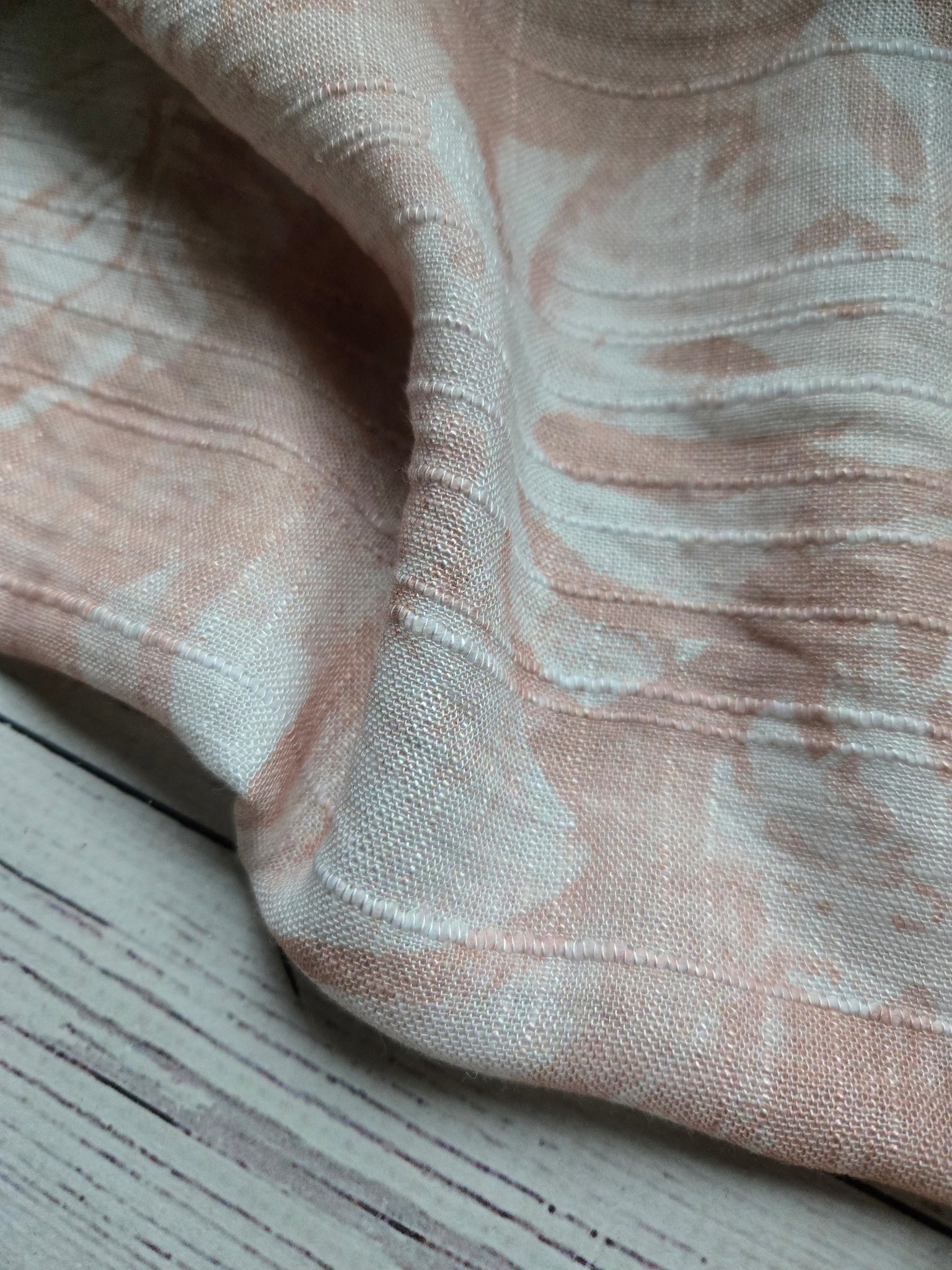 Pink and white tropical print. Textured, slubbed, and horizontally "ribbed" but has good movement and soft hand.
