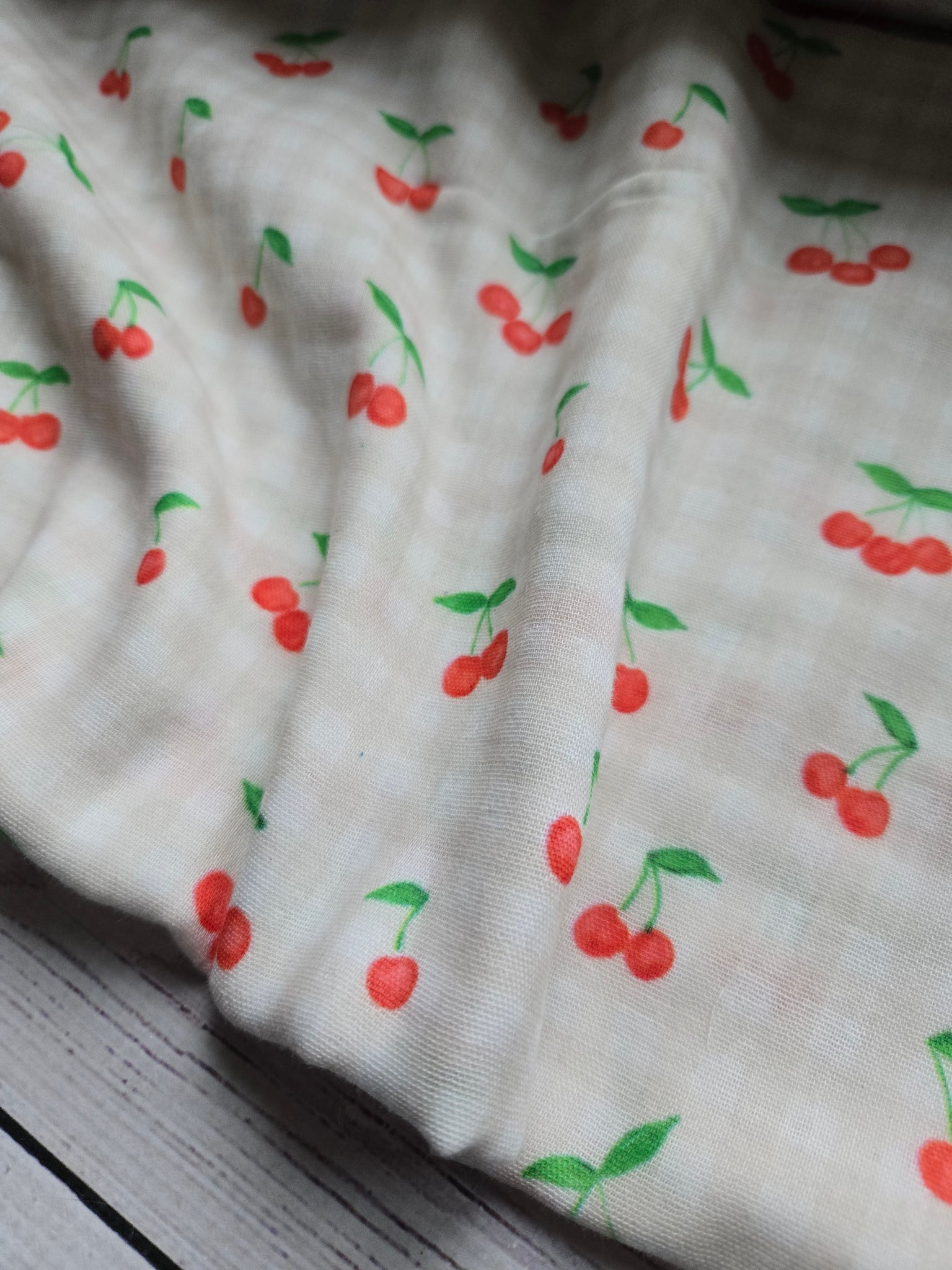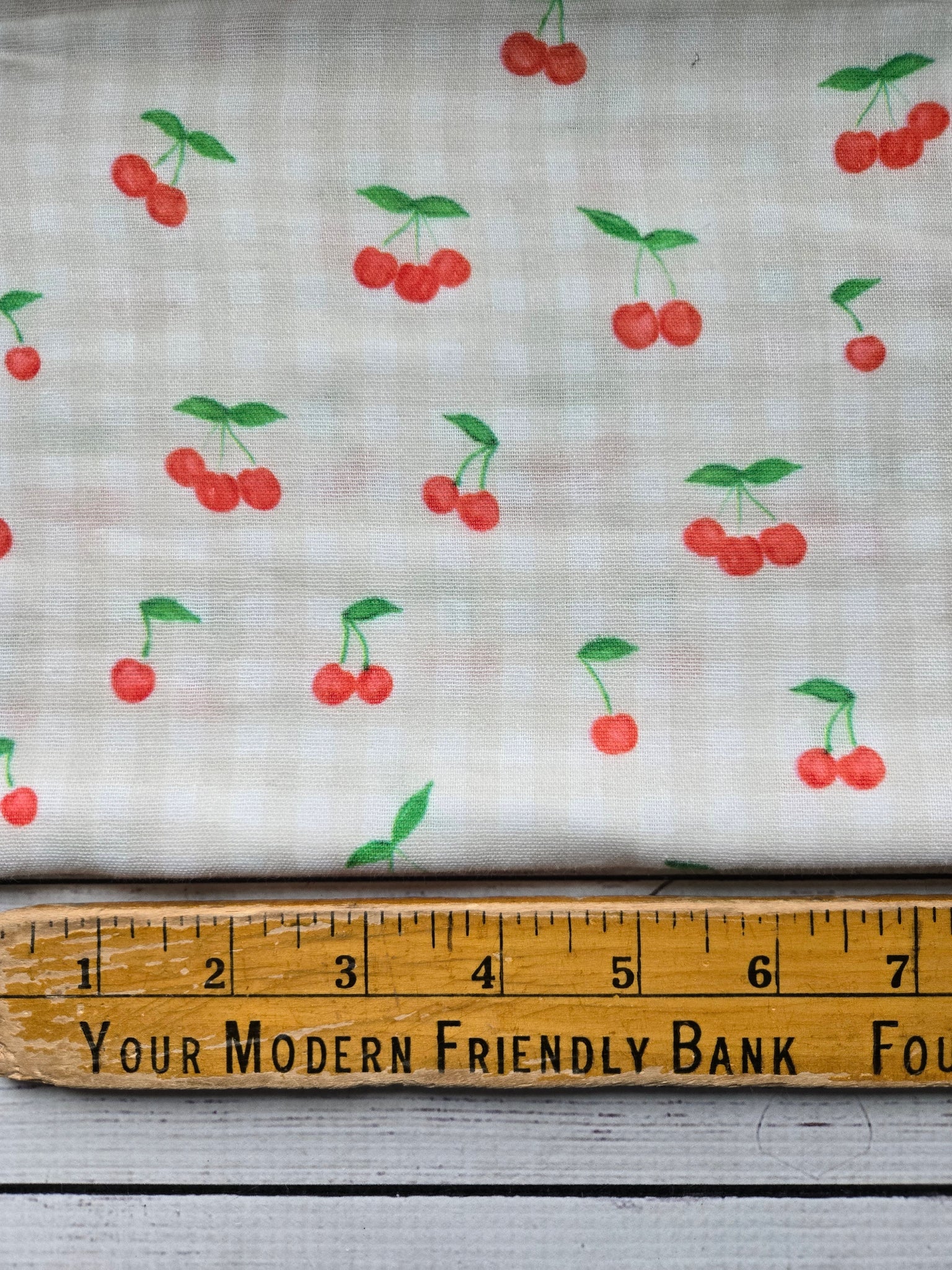 Tan & white gingham with cherries.