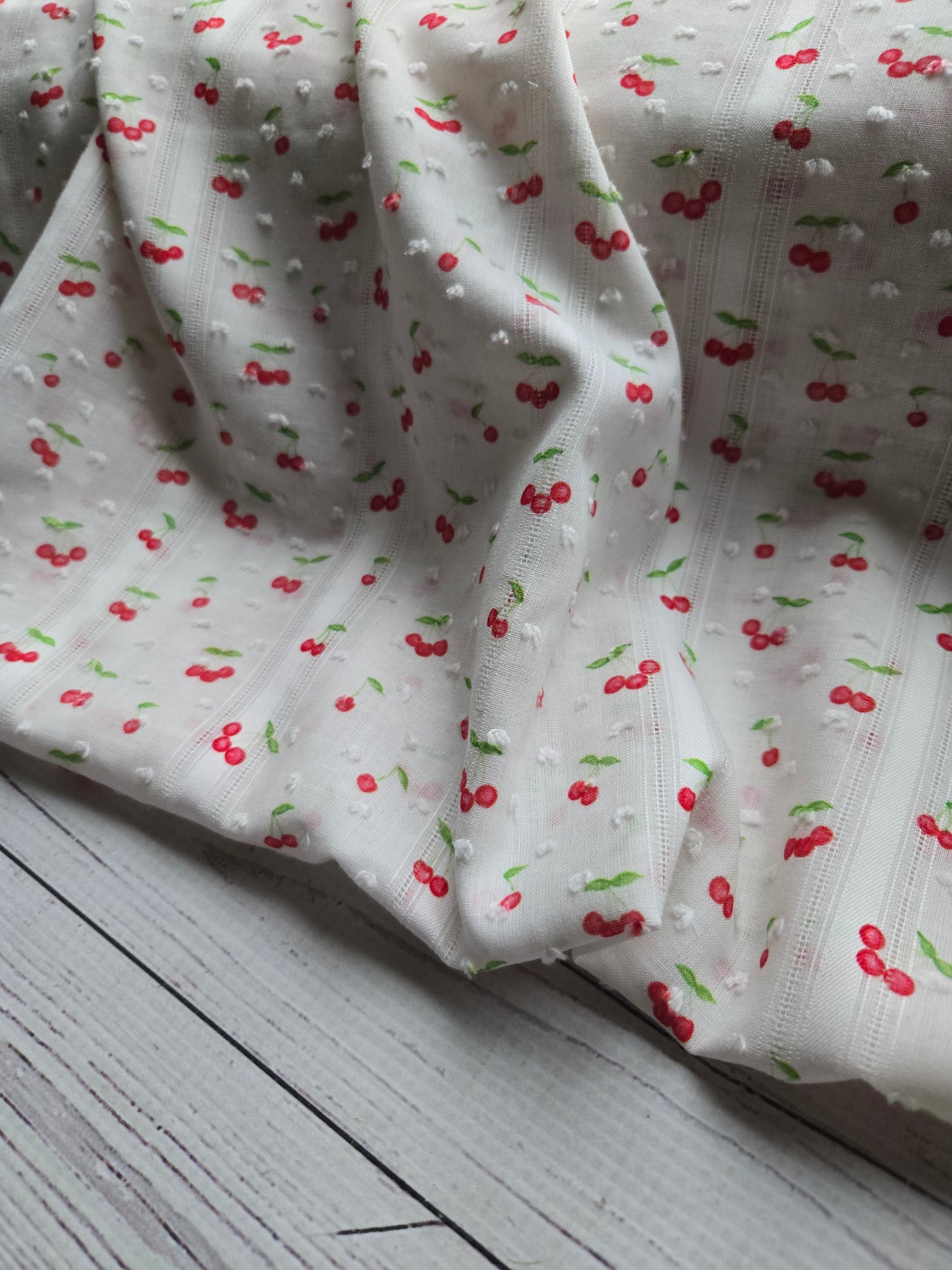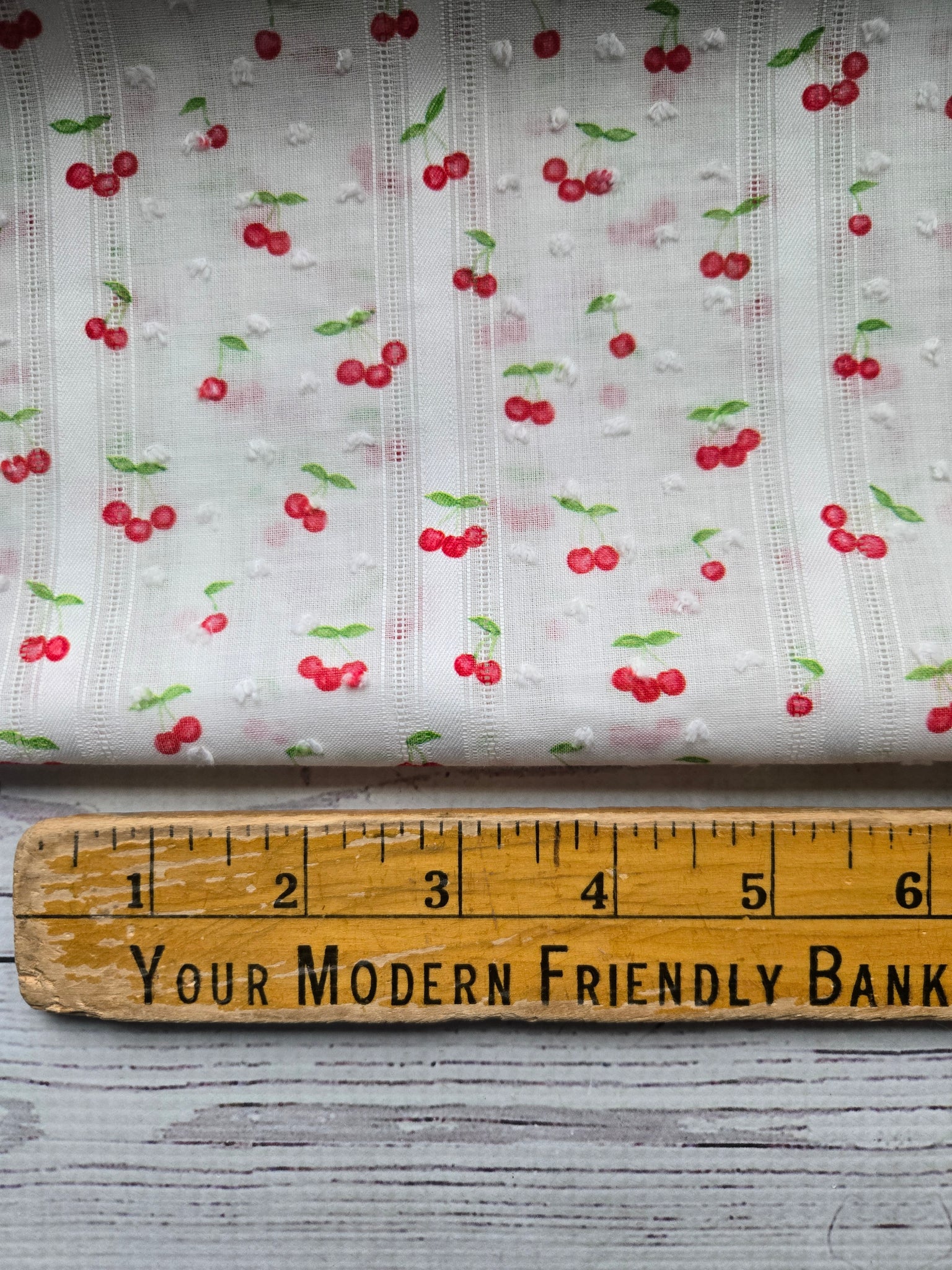 Exclusive Design- White Petite Cherry Print Swiss Dot Cotton {by the half yard}