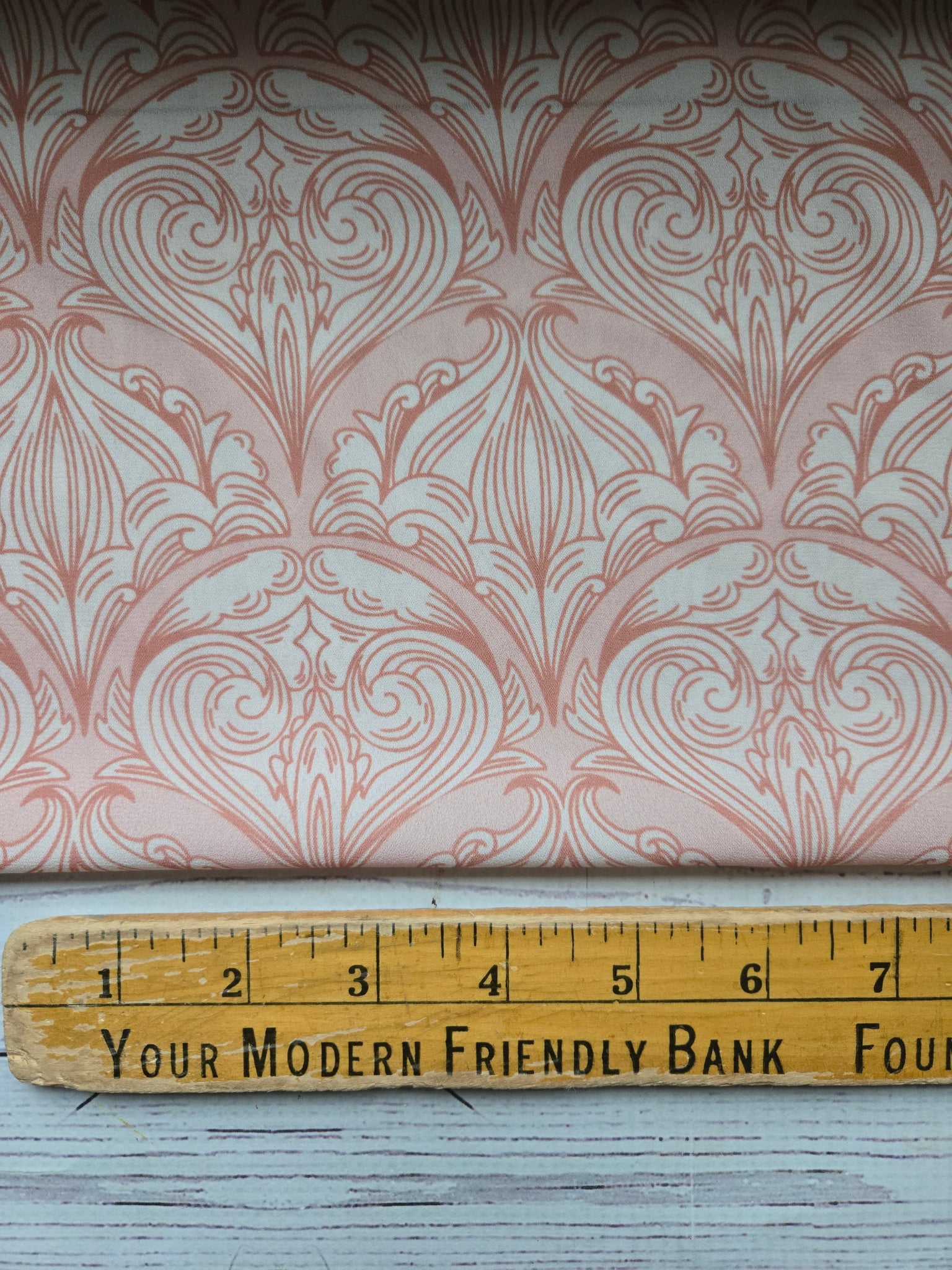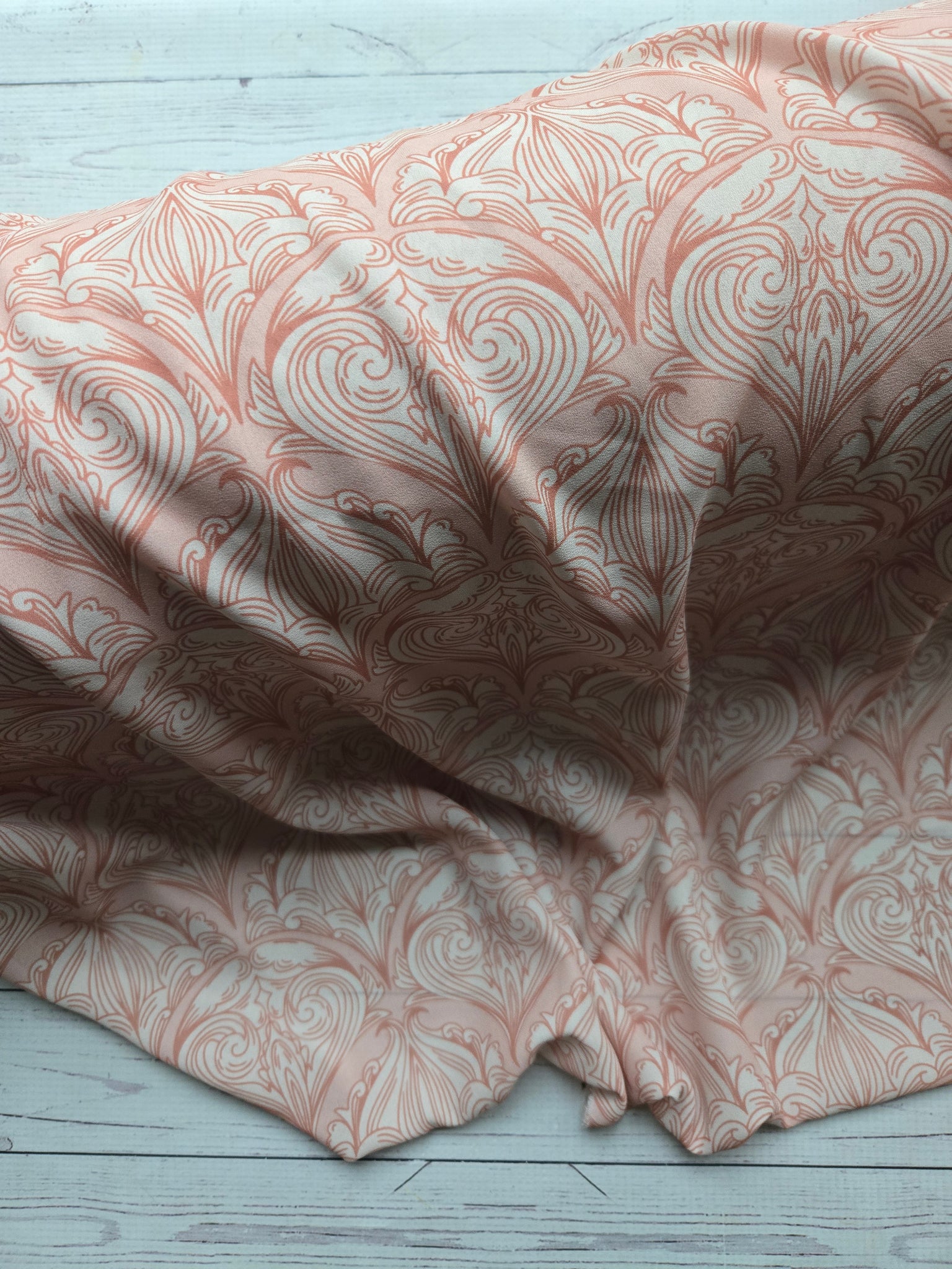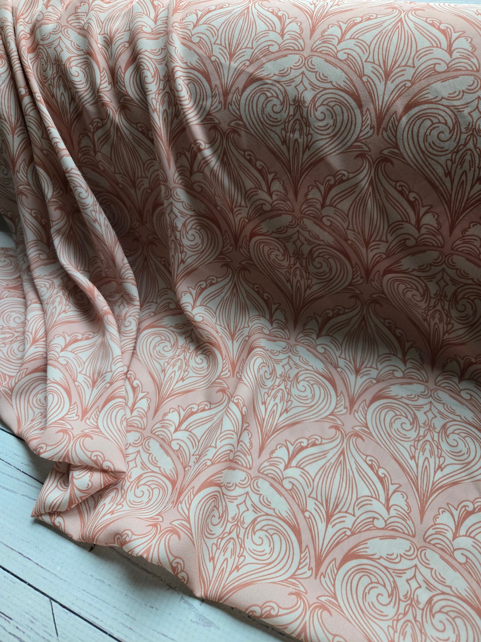 Peachy with cream and orange damask.