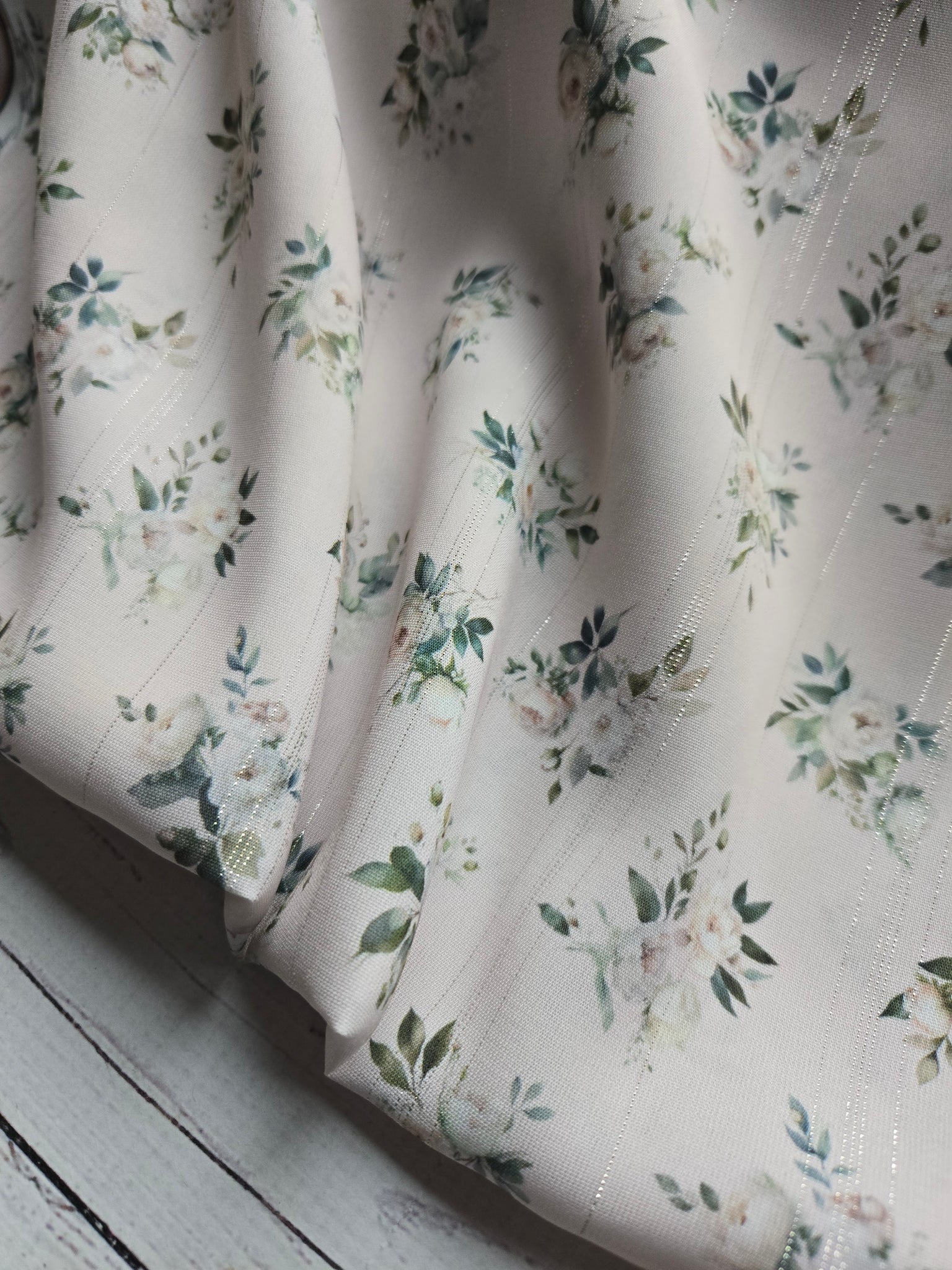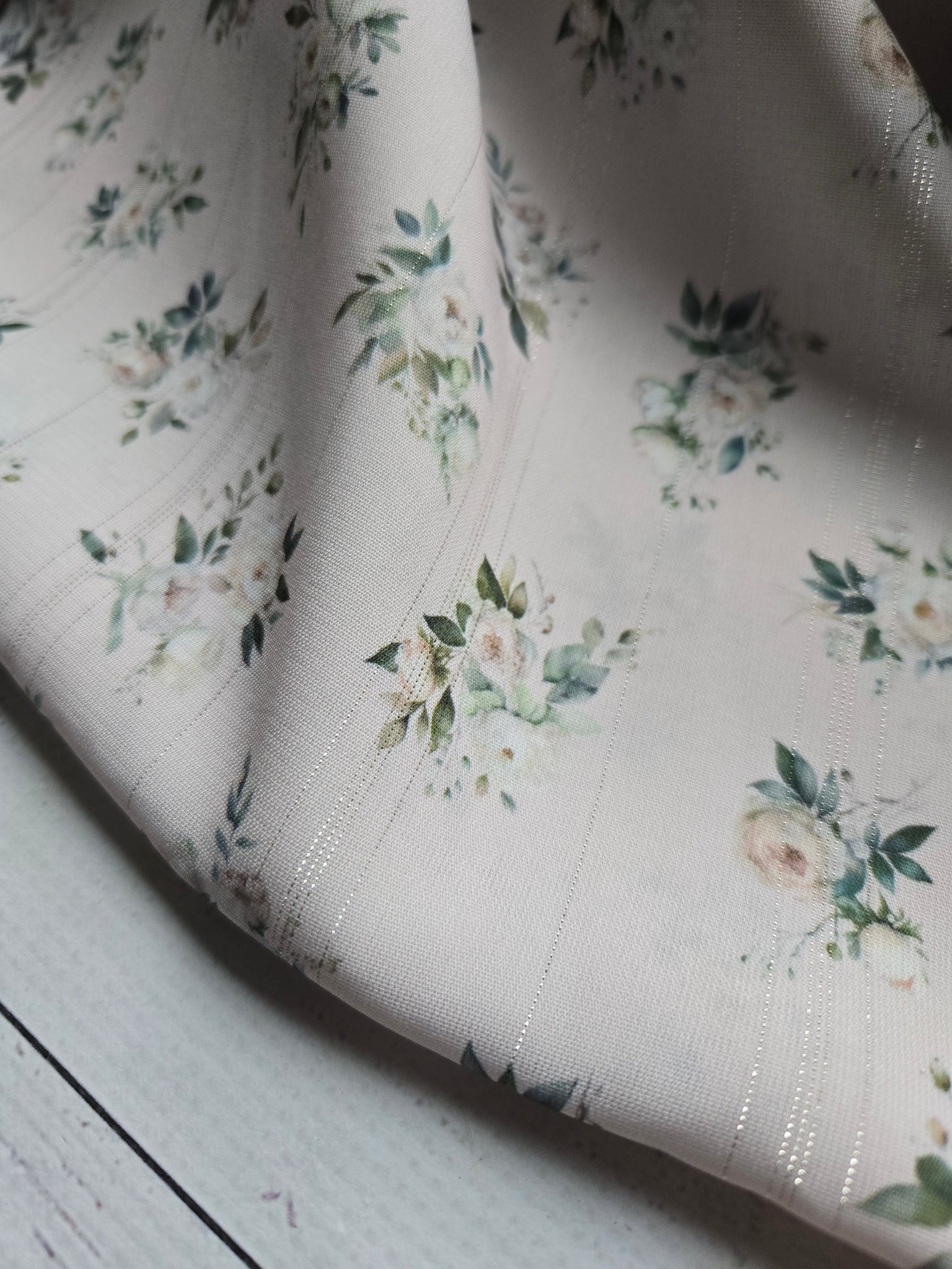 Barely blush with small romantic floral bouquets.